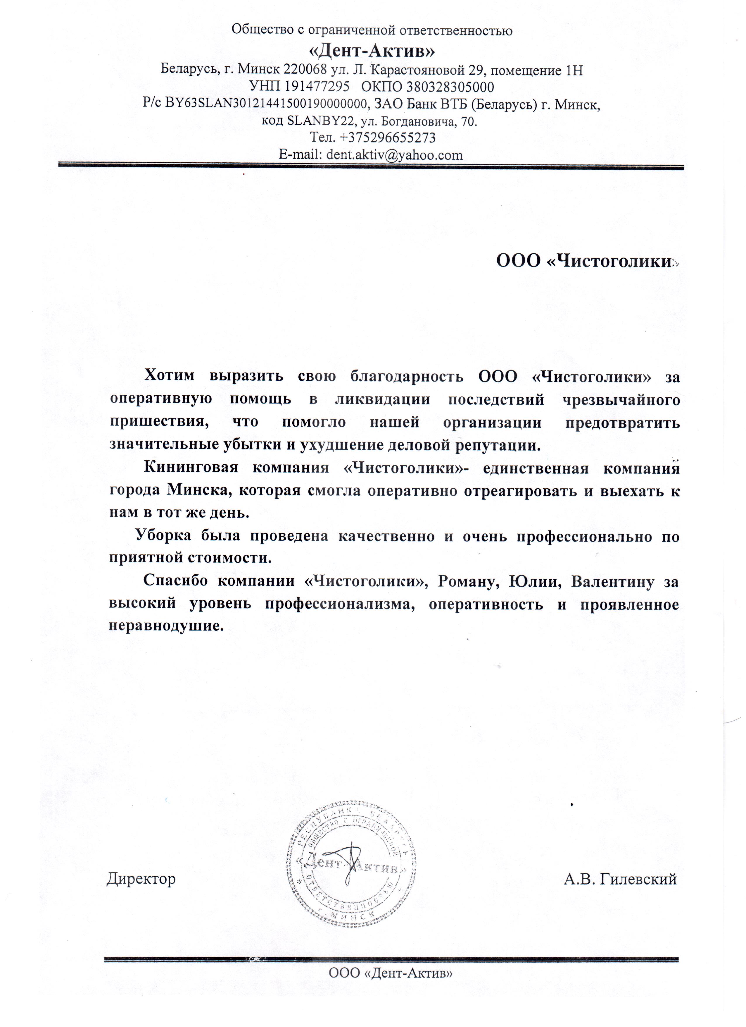 Хотим выразить свою благодарность ООО «Чистоголики» за оперативную помощь в ликвидации последствий чрезвычайного пришествия, что помогло нашей организации предотвратить значительные убытки и ухудшение деловой репутации.