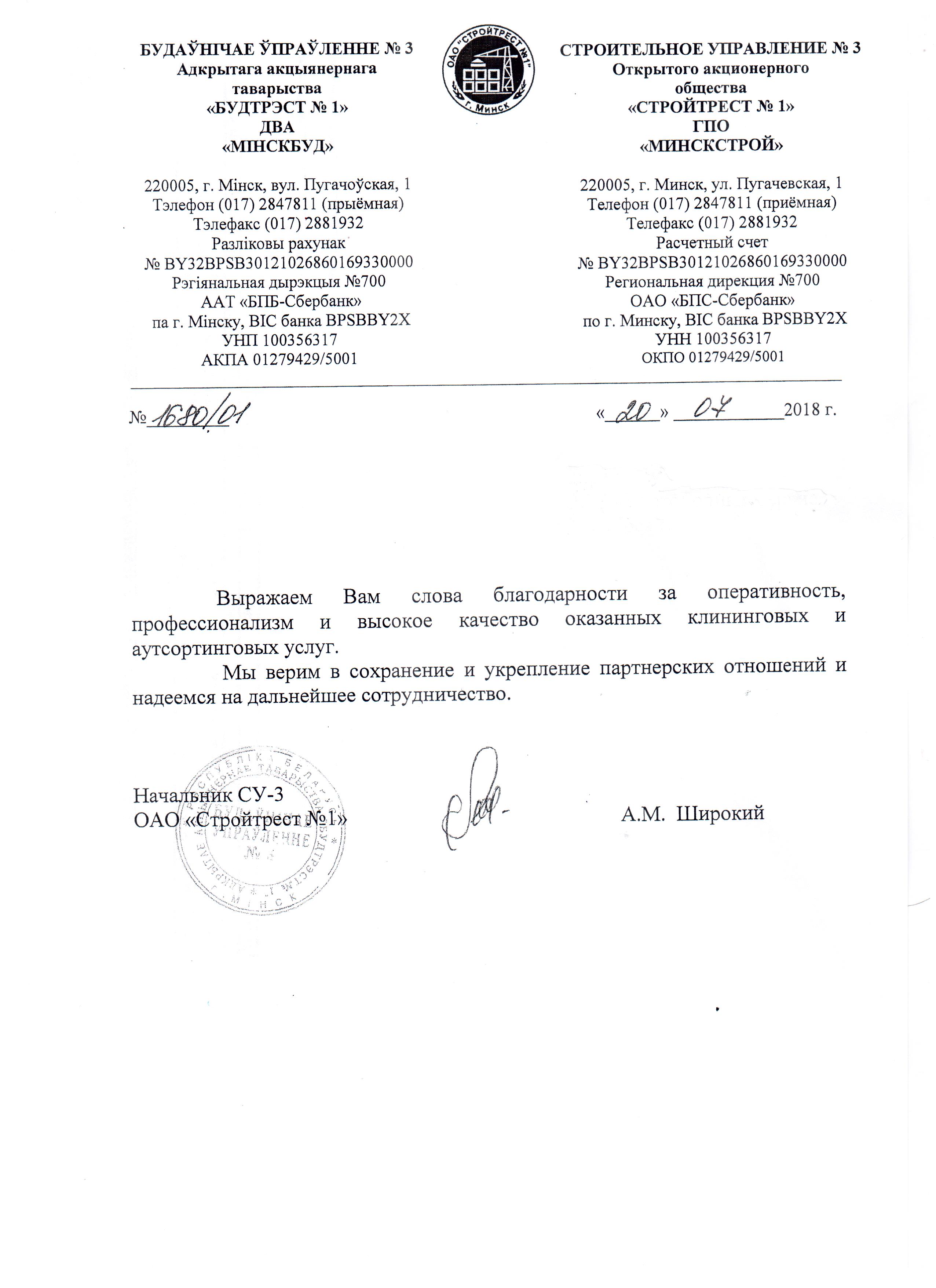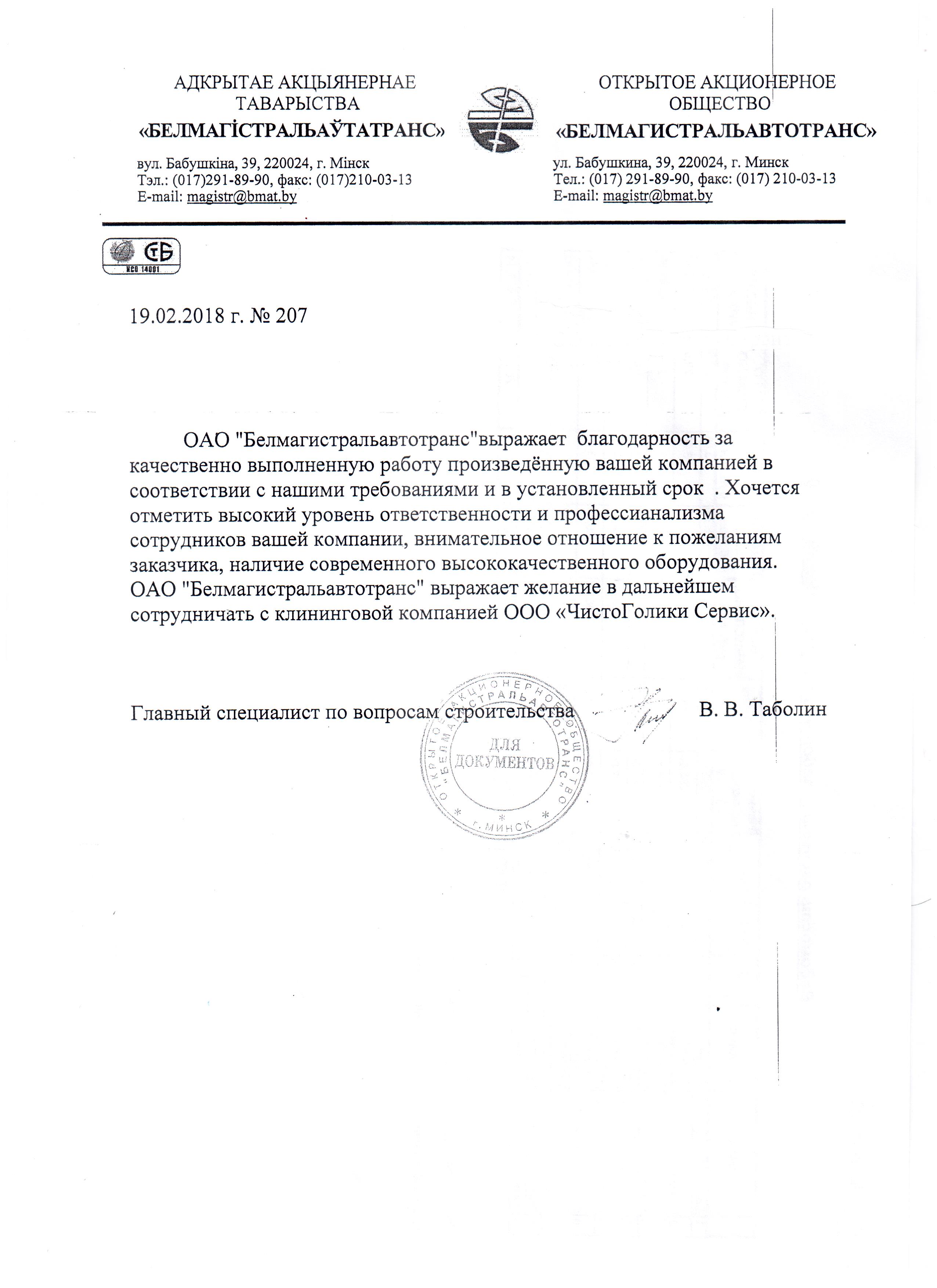 Посмотреть оригиналОАО "Белмагистральавтотранс" выражает благодарность за качественно выполненную работу произведенную вашей компанией в соответствии с нашими требованиями и в установленный срок . Хочется отметить высокий уровень ответственности и профессианализма сотрудников вашей компании, внимательное отношение к пожеланиям заказчика, наличие современного высококачественного оборудования. ОАО "Белмагистральавтотранс" выражает желание в дальнейшем сотрудничать с клининговой компанией ООО «ЧистоГолики Сервис».