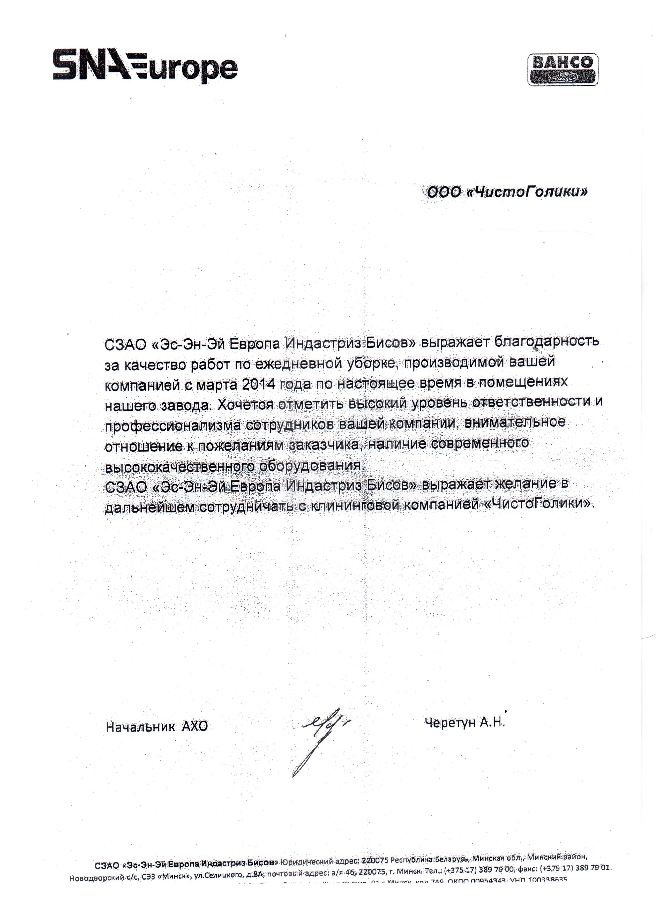 Посмотреть оригиналСЗАО «Эс-Эн-Эй Европа Индастриз Бисов» выражает благодарность за качество работ по ежедневной уборке, производимой вашей компанией с марта 2014 года по настоящее время в помещениях нашего заведа. Хочется отметить высокий уровень ответственности и профессионализма сотрудников вашей компании, внимателное отношение к пожеланиям заказчика, наличие современного высококачественного оборудования.