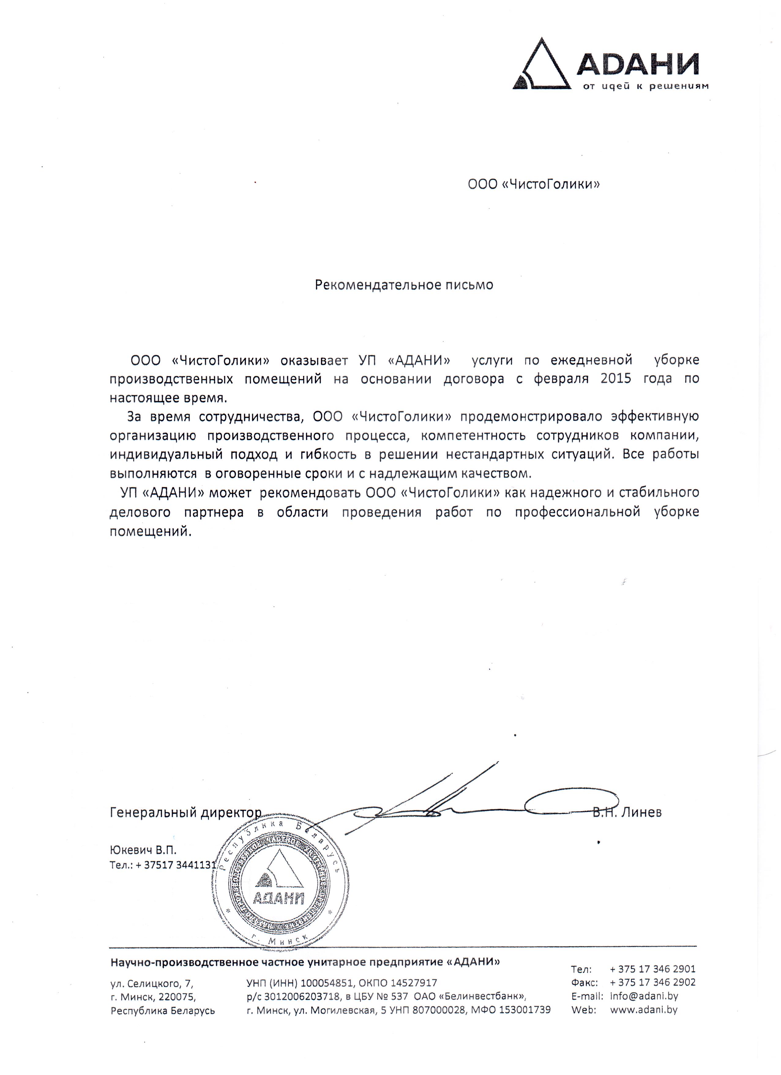 УП «АДАНИ» может рекомендовать ООО «ЧистоГолики» как надежного и стабильного делового партнера в области проведения работ по профессиональной уборке помещений.