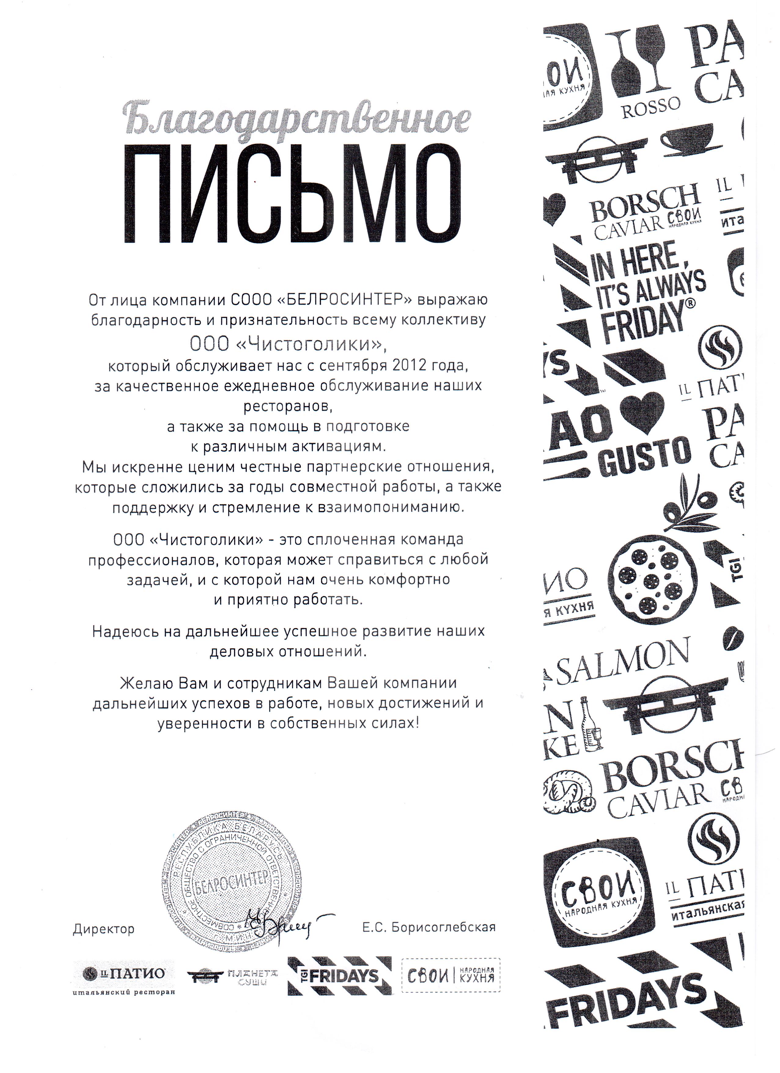 ООО «Чистоголики», который обслуживает нас с сентября 2012 года, за качественное ежедневное обслуживание наших ресторанов, а также за помощь в подготовке к различным активациям. Мы искренне ценим честные партнерские отношения, которые сложились за годы совместной работы, а также поддержку и стремление к взаимопониманию.