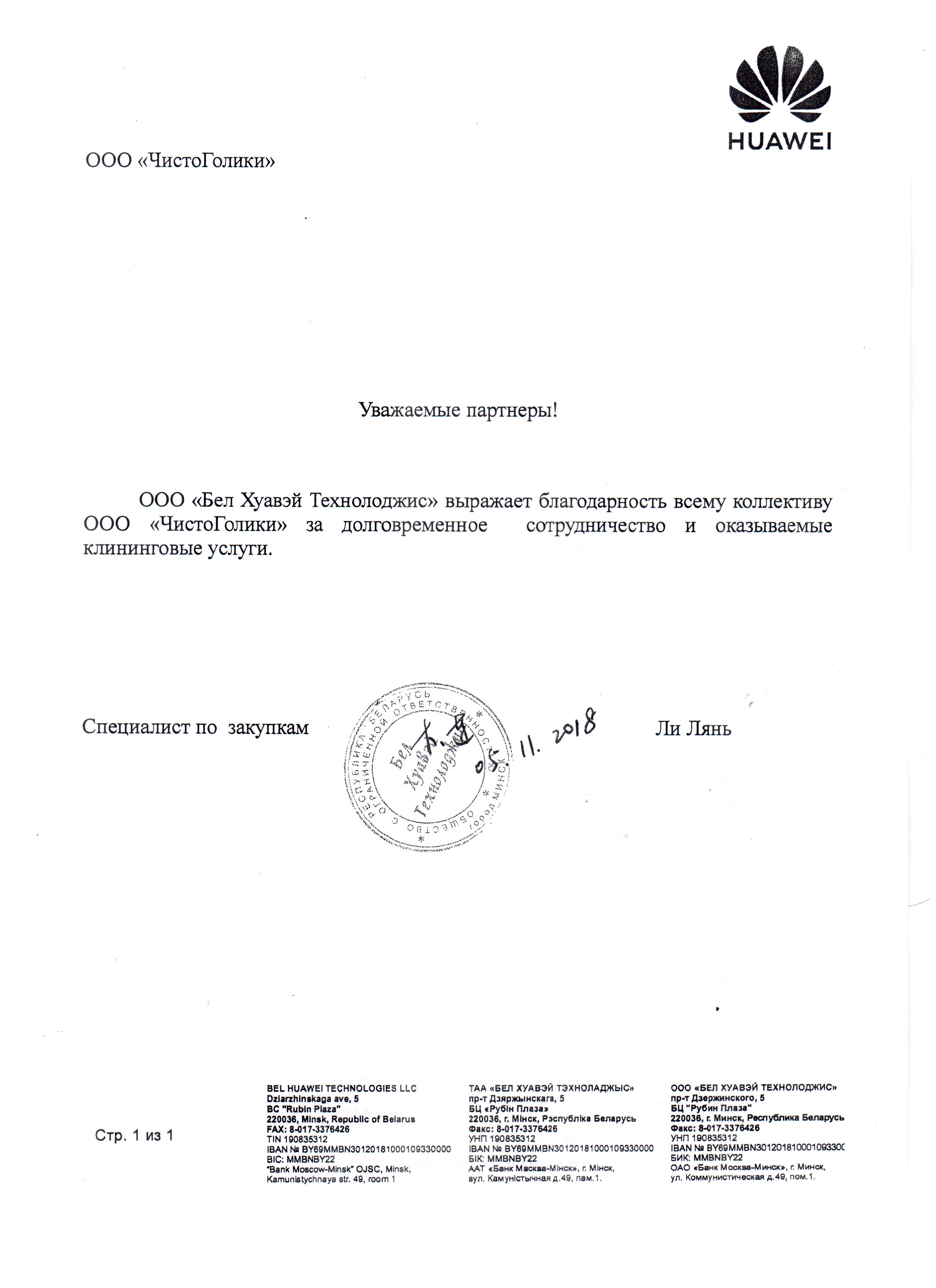ООО «Бел Хуавэй Технолоджис» выражает благодарность всему коллективу ООО «ЧистоГолики» за долговременное сотрудничество и оказываемые клининговые услуги.