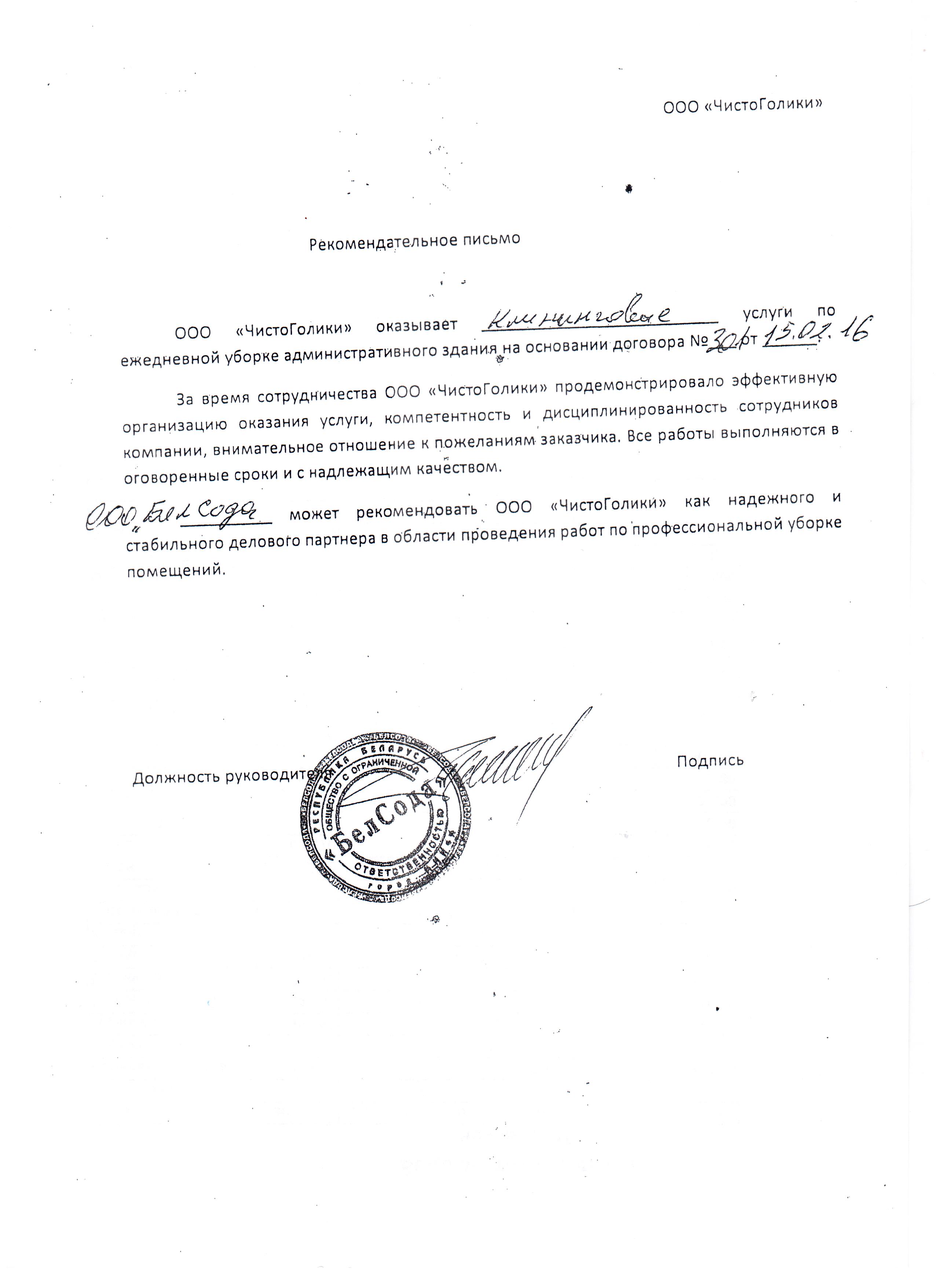 ООО "БелСода" может рекомендовать ООО «ЧистоГолики» как надежного и стабильного делового партнера в области проведения работ по профессиональной уборке помещений.