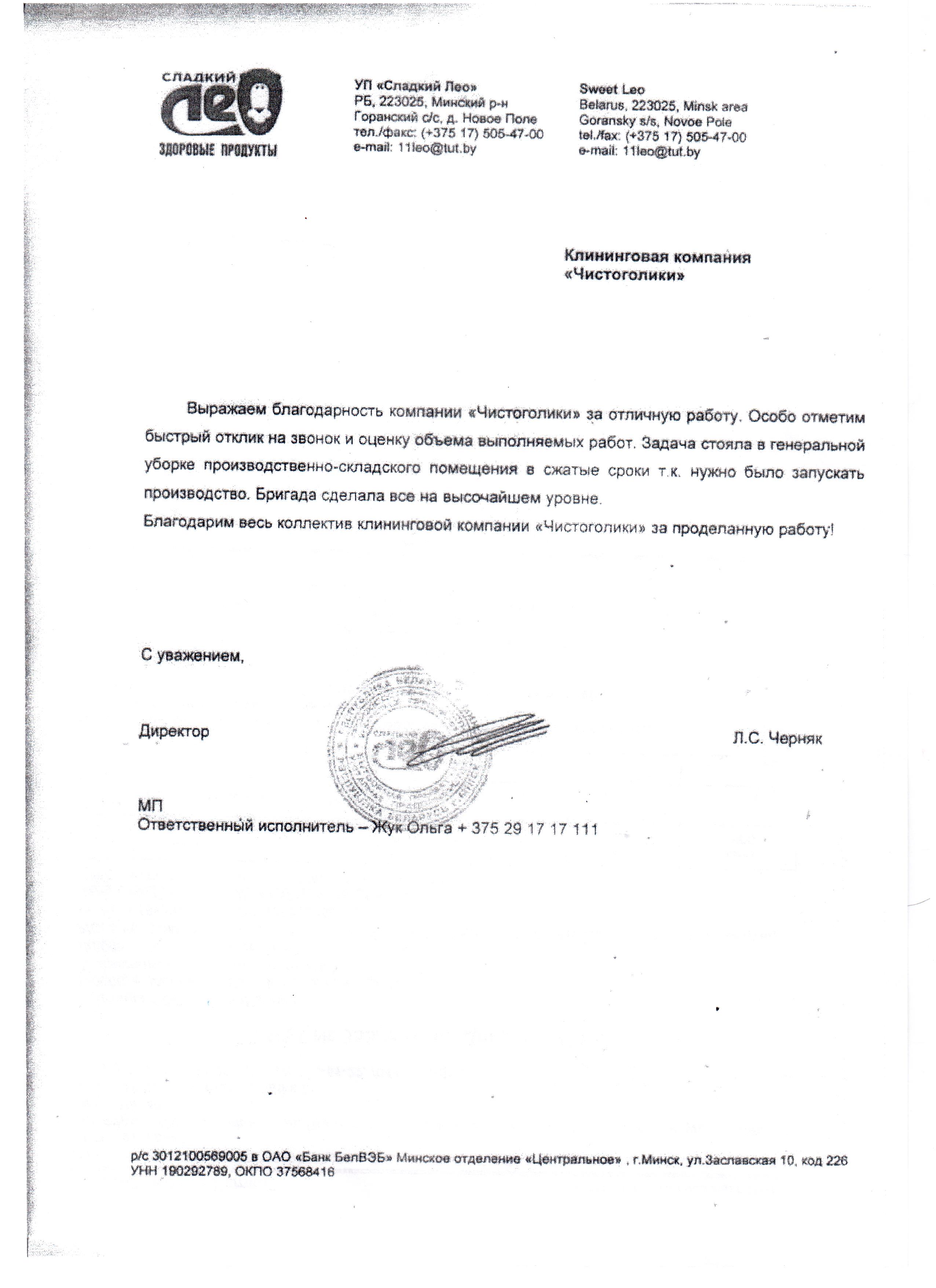 СООО «Культурно-развлекательный центр «Виктория» (казино «Виктория») выражает благодарность за качество работ по комплексной уборке, производимых вашей компанией с августа 2009 года по настоящее время в помещениях казино. Хочется отметить высокий уровень ответственности и профессионализма сотрудников вашей компании, внимательное отношение к пожеланиям заказчика, наличие современного высококачественного оборудования, позволяющие производить уборку помещений без остановки деятельности казино.