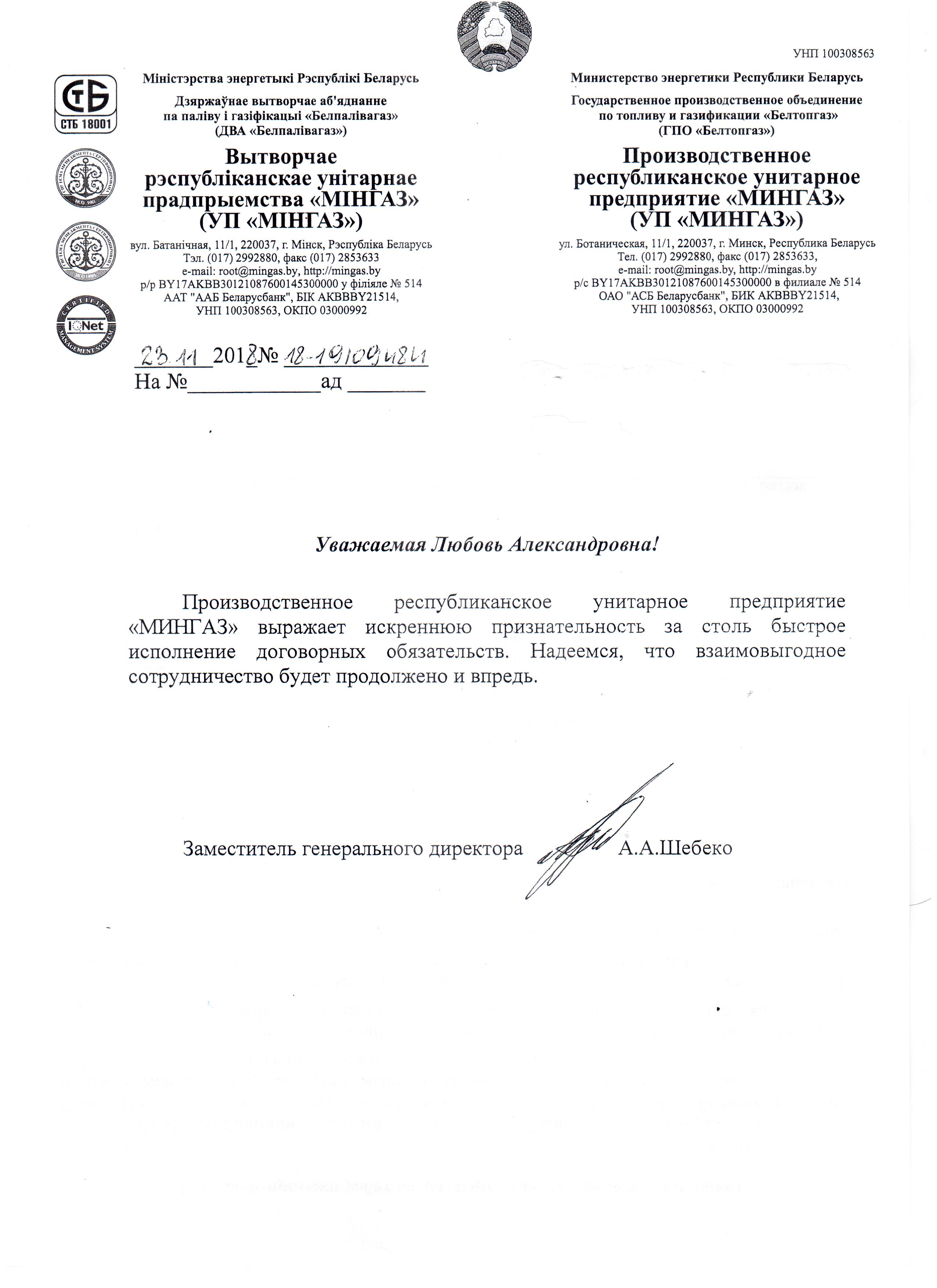Посмотреть оригиналПроизводственное республиканское унитарное предприятие «МИНГАЗ» выражает искреннюю признательность за столь быстрое исполнение договорных обязательств. Надеемся, что взаимовыгодное сотрудничество будет продолжено и впредь.